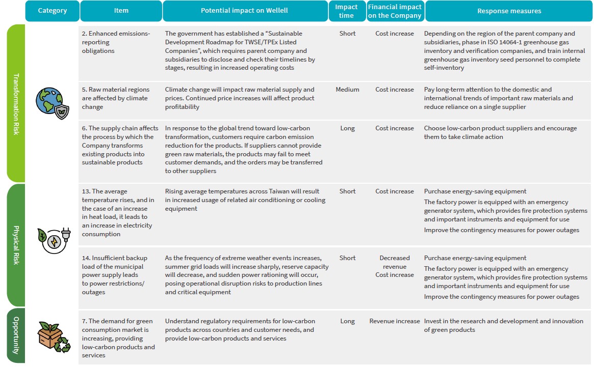 According to the reports and discussions of the Sustainability Committee and senior management, five climate-related risks and one climate-related opportunity were identified, with the following response measures proposed: