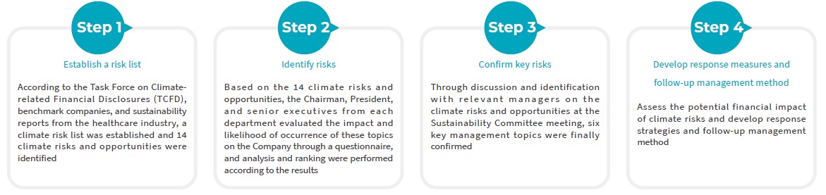 Wellell identifies climate risks following the TCFD framework, and the ESG Office refers to the Task Force on Climate-related Financial Disclosures (TCFD), benchmark enterprises, and sustainability reports from the healthcare industry to collect topics, and has summarized 14 climate risks and opportunities. A questionnaire is sent to the Chairman, President, and senior executives of various departments to evaluate the likelihood and impact of climate risk issues. The results are analyzed and ranked, and finally a sustainability committee meeting is convened to discuss and identify climate risks and opportunities with relevant members, and corresponding measures are formulated. Meanwhile, the identification results are included in the sustainability report, and a report is submitted to the Board of Directors at least once a year.