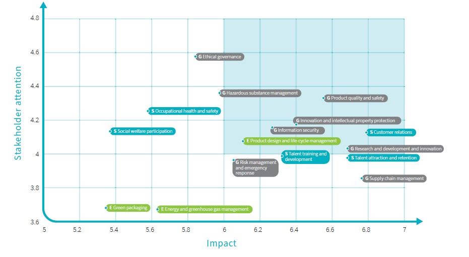 After analysis and discussion, and combining similar topics, five material topics were finally selected for the current year, including information security, innovation and intellectual property protection, product quality and safety, product design and life cycle management, and customer relations. Compared to the identification results of material topics in the previous year, the results this year changed significantly, as they were obtained through a questionnaire survey to collect opinions from internal and external stakeholders, while expanding the scope of industry-related topics and adjusting the material topics. As a result, innovation and intellectual property protection, product design and life cycle management, and customer relations were added. However, topics not included in the previous year will continue to be managed under the existing procedures.