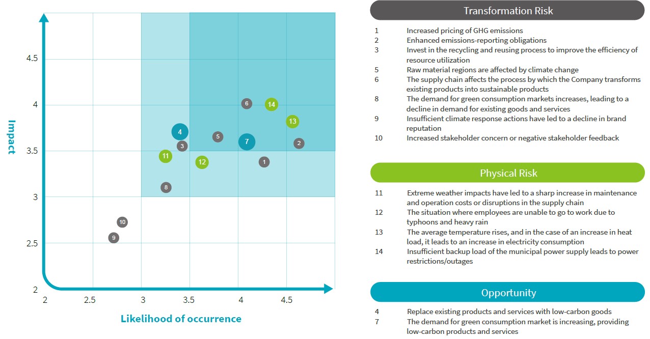 According to the reports and discussions of the Sustainability Committee and senior management, five climate-related risks and one climate-related opportunity were identified, with the following response measures proposed: