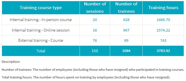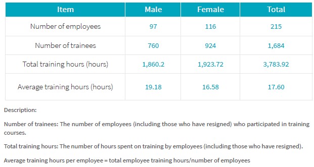 With regard to the statistics on employee education and training (including both internal and external training) in 2024, a total of 1,684 employees were trained, with a total training duration of 3783.92 hours. The average training time per employee was 17.6 hours. The total cost of external training amounted to approximately NT$120,000, while around NT$2 million was invested in internal training.